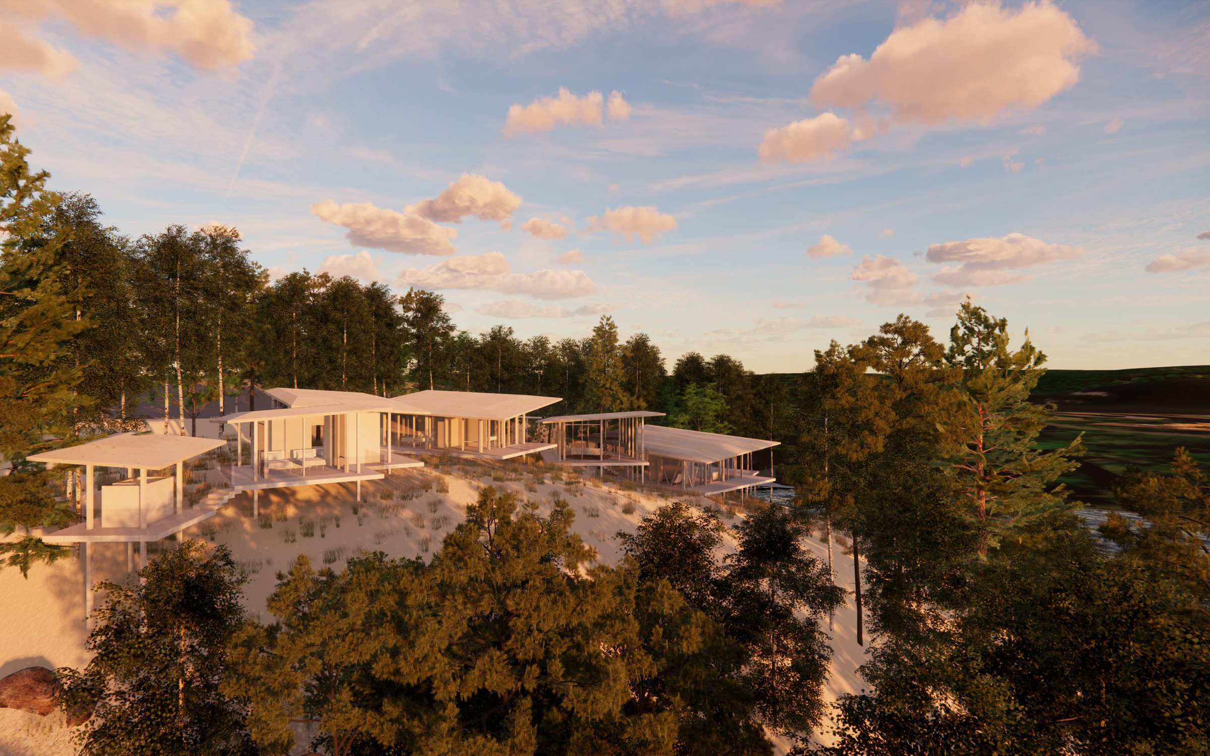 Located on a narrow ridge sloping toward a protected lake in Ontario, the Devil Lake House is conceived as a series of seasonal cabins that disperse and connect to take advantage of the panoramic views of the lake to the south and the forest to the west. The final structure creates a modern expansion to an existing multi-family compound overlooking Devil Lake.